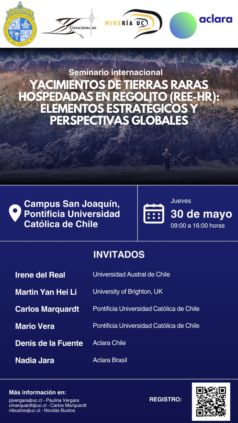 Este 30 de mayo se desarrollará el Seminario Internacional “Yacimientos de Tierras Raras Hospedadas en Regolito (REE-HR): elementos estratégicos y perspectivas globales”, que se llevará a cabo en el Campus San Joaquín de la Pontificia Universidad Católica de Chile.